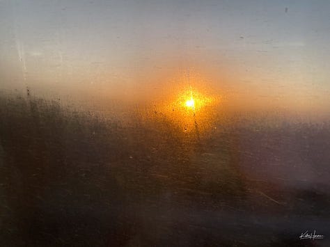 Sunset through a steamed up train window