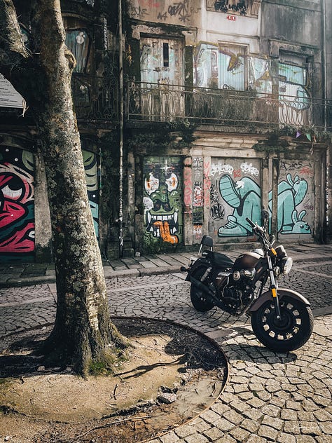 Motorcycle parked in front of street art in Porto